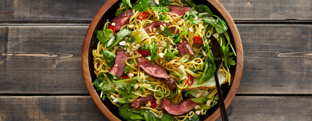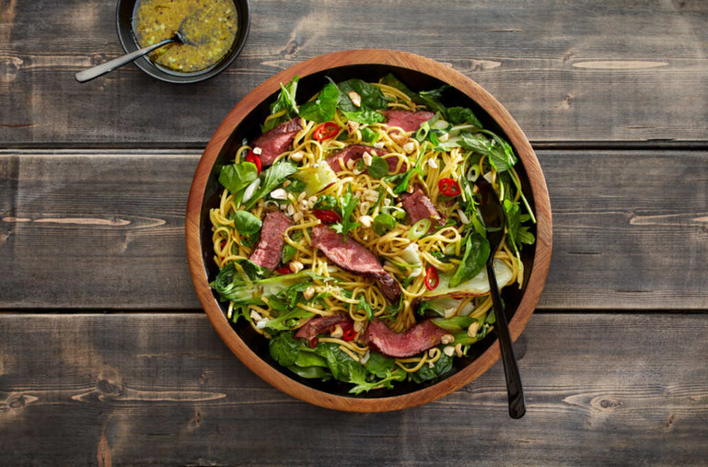 Allow the steak to rest on a plate, spoon some of the dressing onto the steak and cover with foil to keep warm. - Place the pak choi in the frying pan and, over a high heat, char slightly for a minute; remove the pak choi from the pan. Add the noodles and chilli to the pan with the remaining dressing and half the spring onions and stir until piping hot.